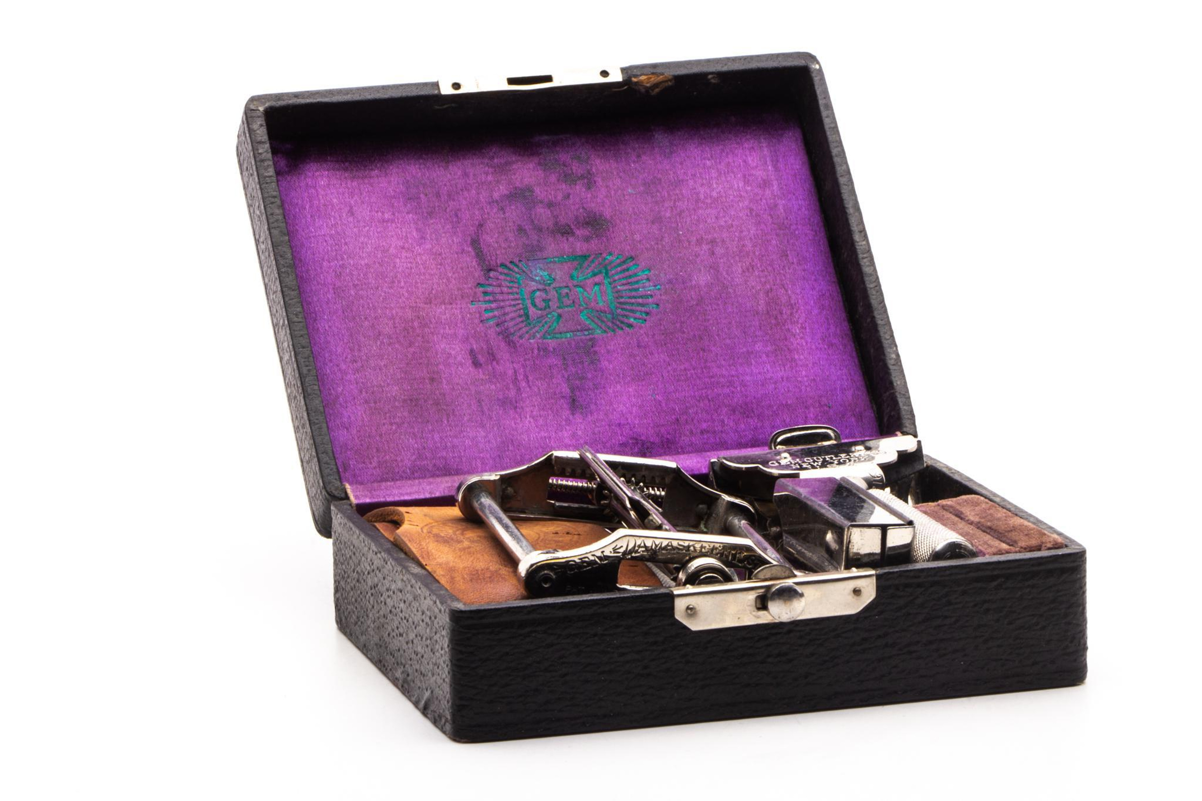 Available is a handsome Gem Single Edge Set. Featuring a single edge razor, blade holder, strop and strop handle, and original packing slip and leather case! This is a historic travel set, perfect for display and for the adventurous shaver!