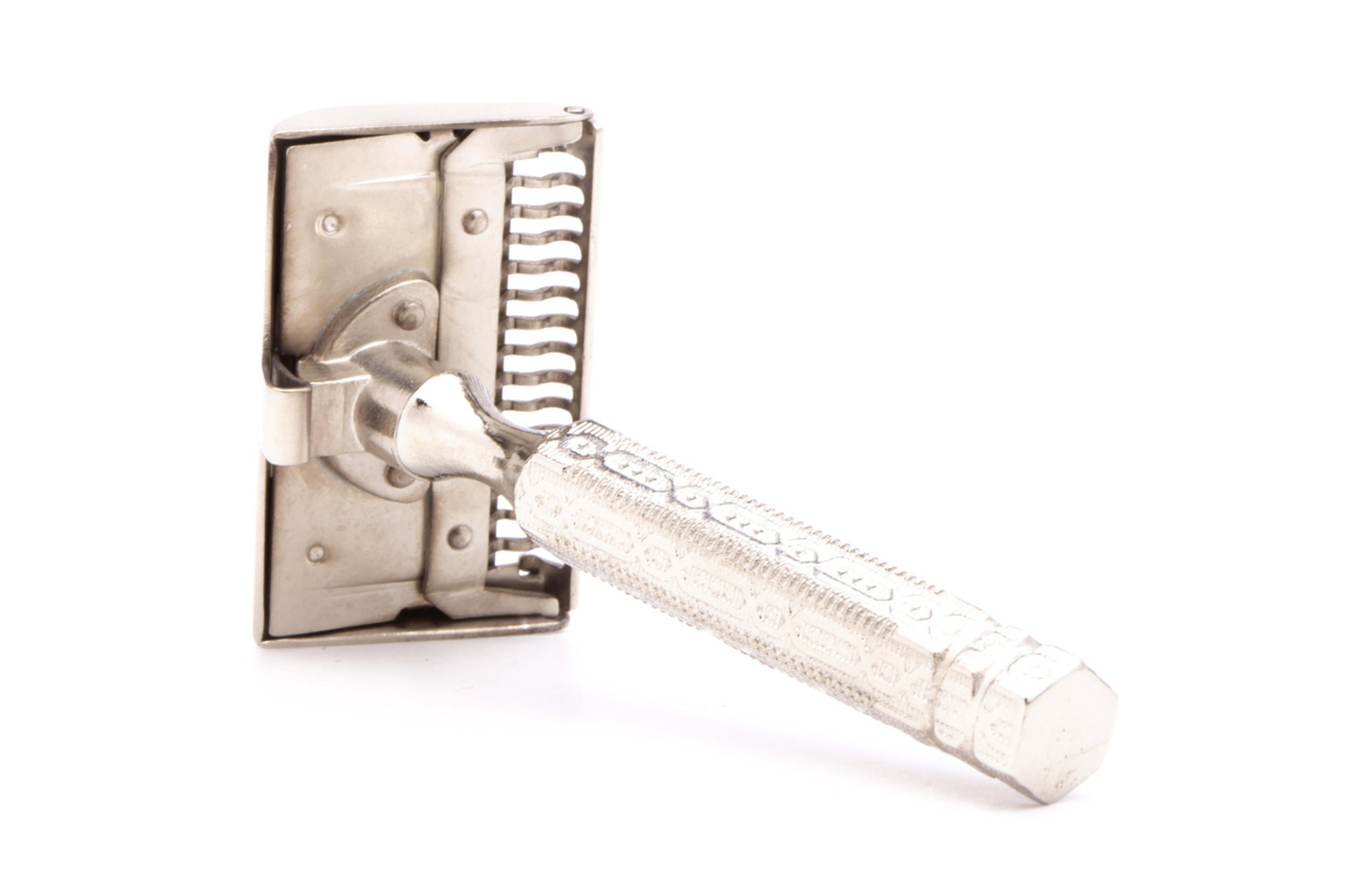 Available is a classic razor- the 1912 Chain handle style Single Edge Razor with an Ever Ready head. Single Edge razors are great shavers that are described to feel much like a traditional straight razor. Beautifully Revamped in fresh Nickel and mechanically tuned up to provide a lifetime of great shaves. Add single edge blades to your cart and enjoy a unique shave experience.