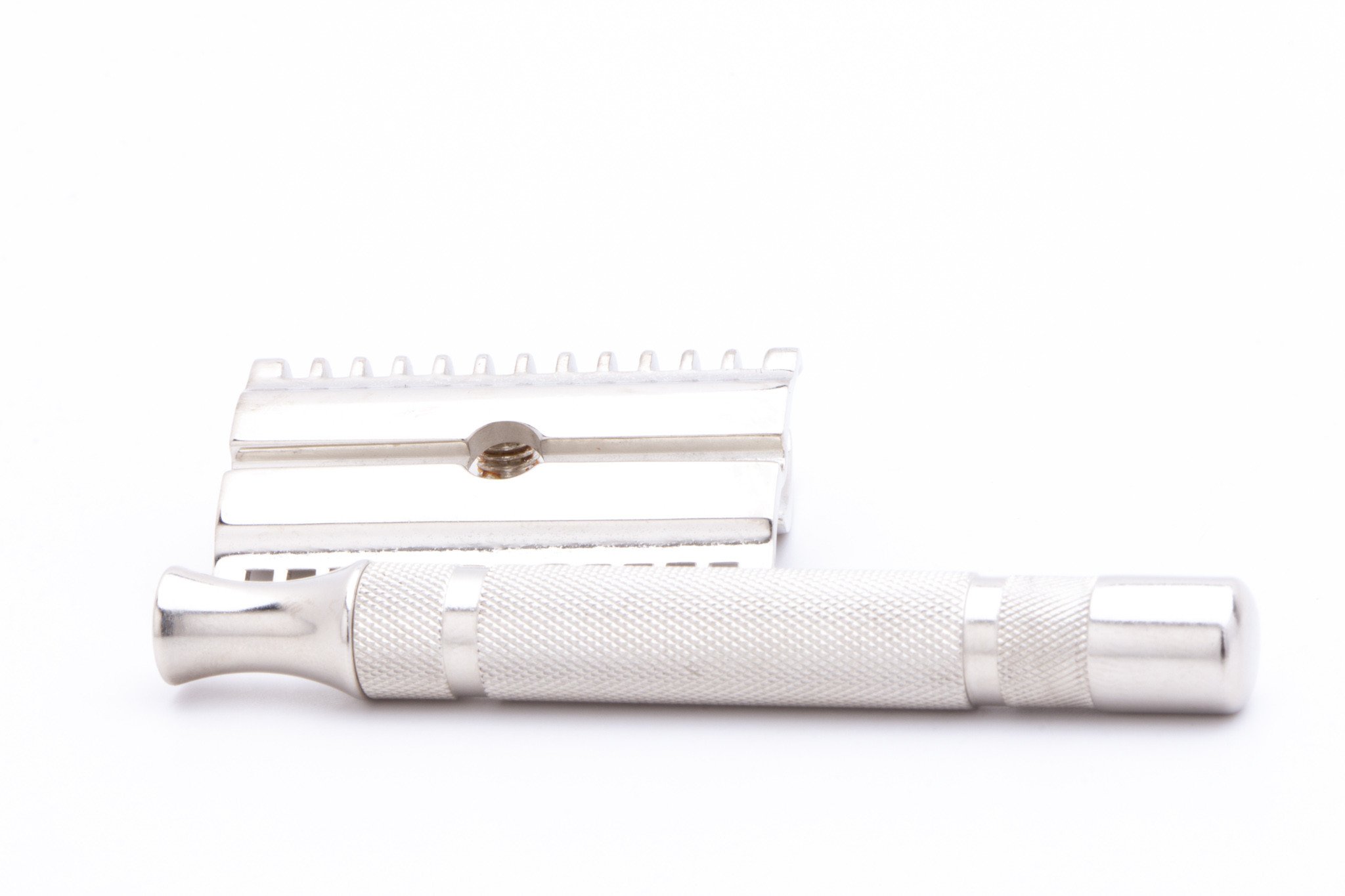 A wonderful old time razor, with medium to aggressive shaves and a gorgeous Factory Nickel shine! This razor features the thin common bar handle, definitely not so common- tough to find!