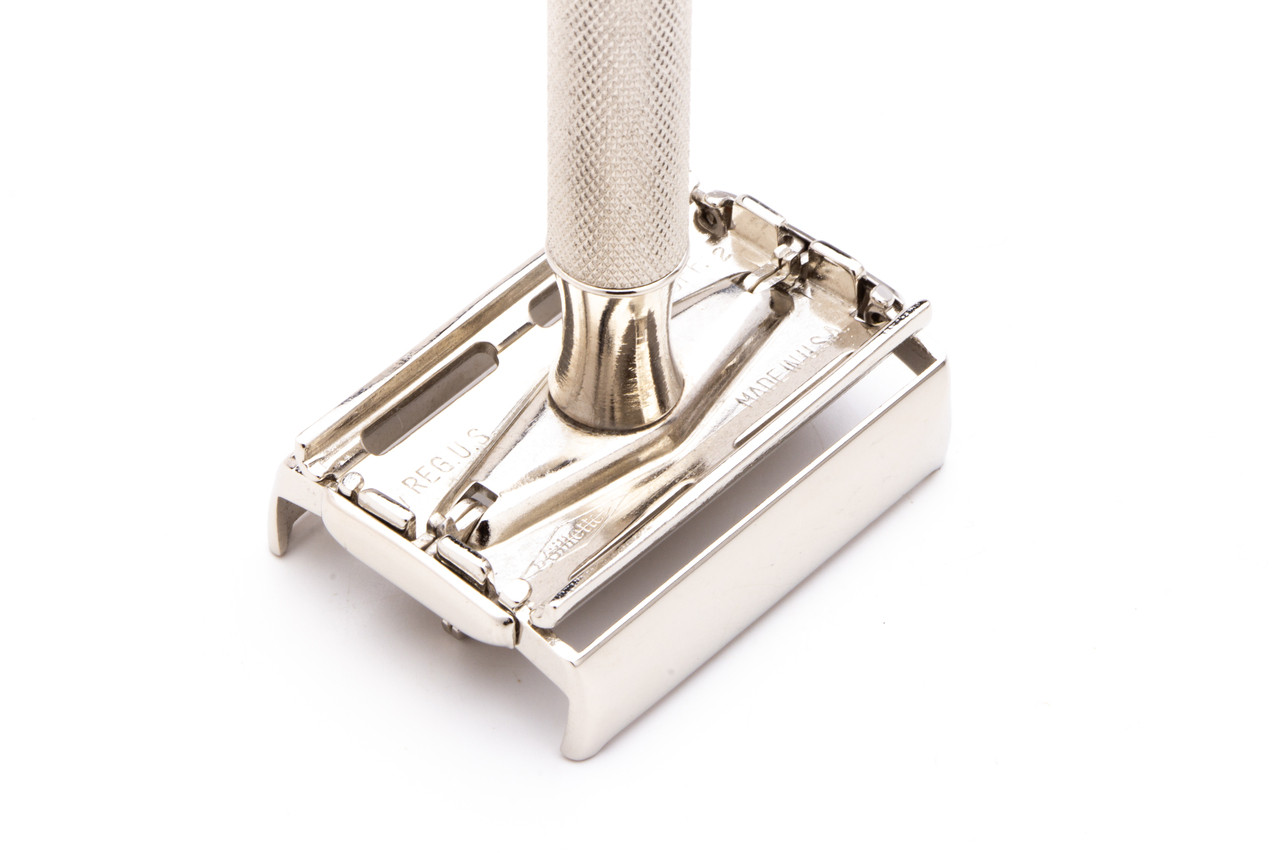 One of the classic DE razors ever to be made - the Black Tip Super Speed. Great overall condition on this Black Tip. Nothing bent or broken- great mechanical condition. Razor has been restored, buffed, aligned, ultra-sonically cleaned, sanitized, revamped in Nickel and arrives to you shave-ready. TTO works well, and doors open smooth as butter just as they should. Great razor option for someone new to wet-shaving who is looking for a good quality starter razor.
