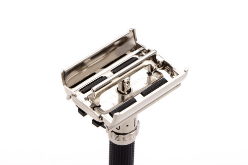 For those who prefer a long handle and adjustable shave, look no further than the Gillette "Black Beauty!" This razor features a brass head with original nickel plating and aluminum handle. Wet-shavers world-wide respect the quality and popularity of this renowned adjustable razor. The adjuster works very easy, and spins from 1-9, changing the amount of blade gap exposed during your shave. The higher the number, the bigger the blade gap (thus more aggressive of a shave), the smaller the gap (more mild shaves).