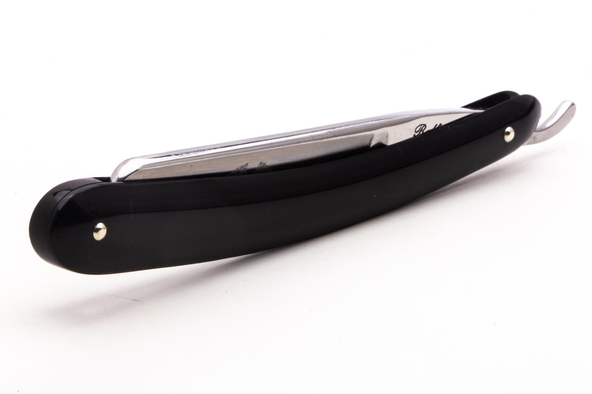 This is a perfect beginner straight razor for someone who understands you will only be a beginner for your first shave. 6/8 vs 5/8 means this razor will provide a buffer against frequent honings while you are perfecting your strop and hone techniques and will protect against any beginner straight razor mistakes. Instead of a round point, this Spanish point is sexy with classic, durable scales.