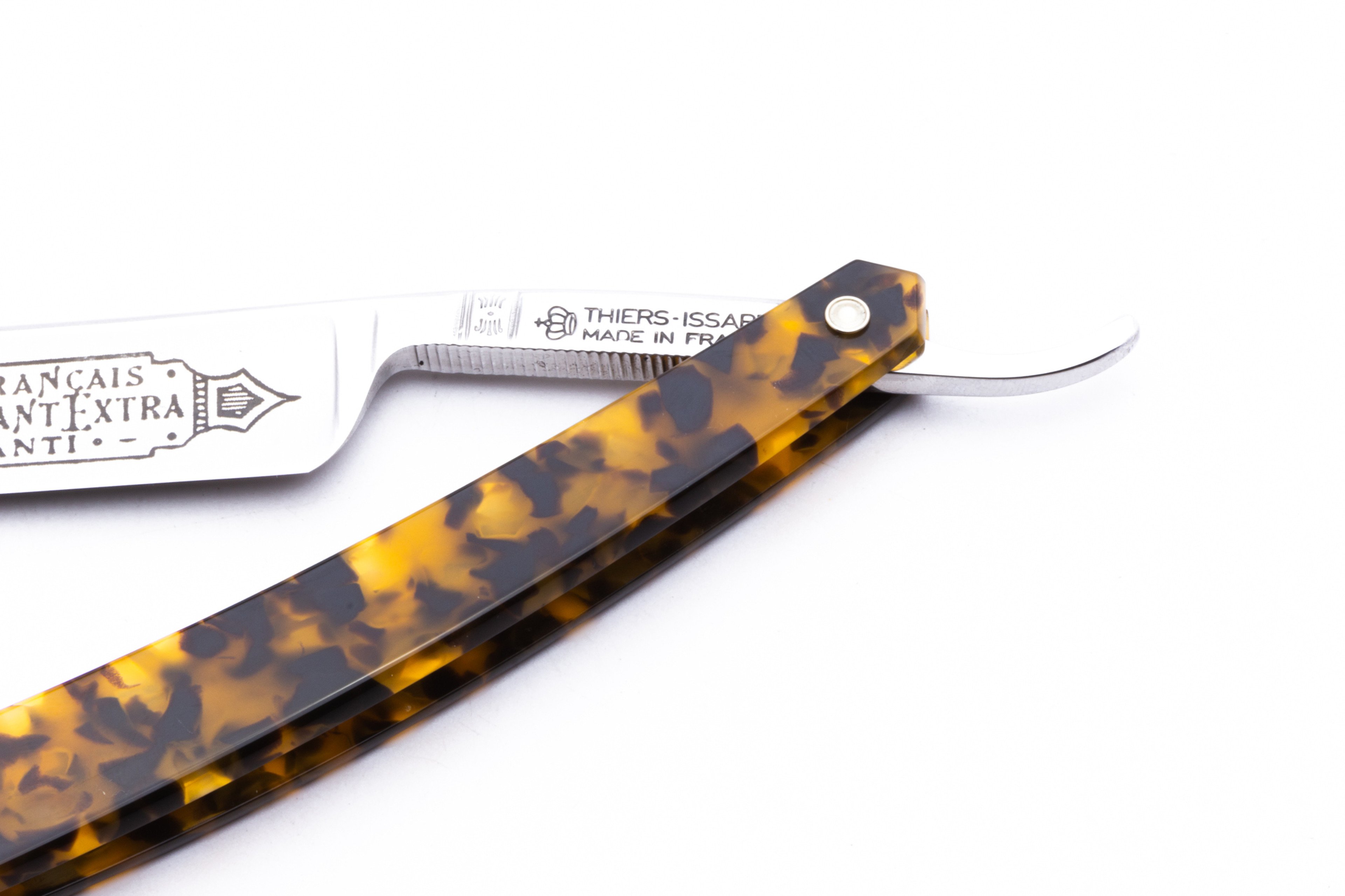 This Thiers Issard straight razor bears an elegant "Evide Sonnant Extra" black mark, that identifies it as a full hollow ground singing blade. Each razor comes in a protective black leather case. Tortoise shell handle.