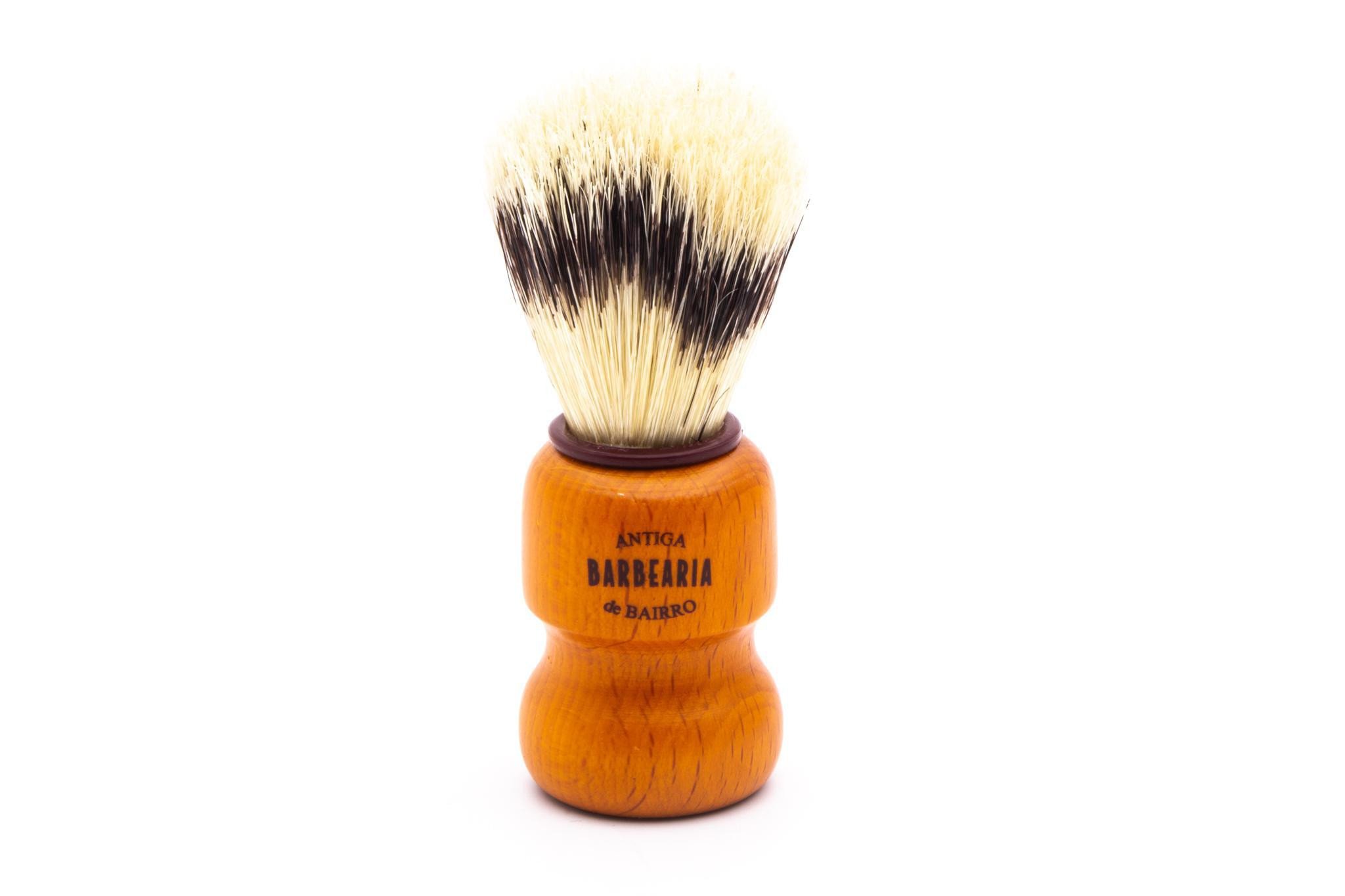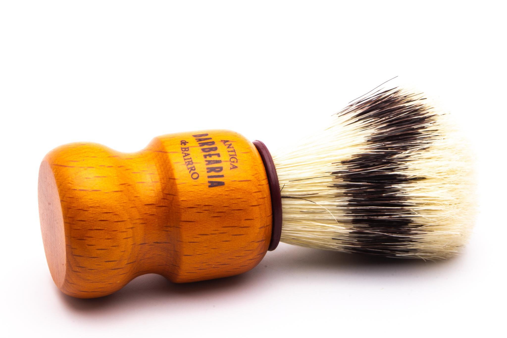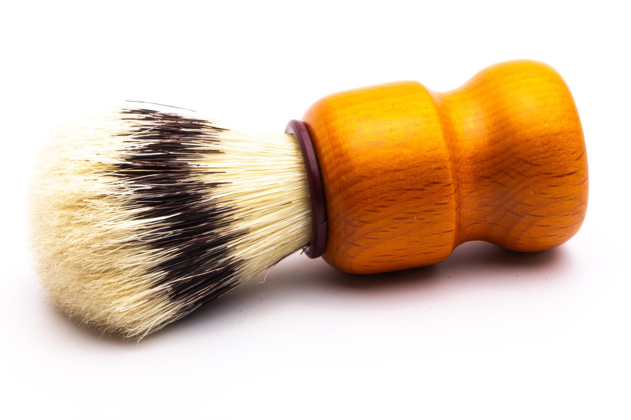 A hand made shaving brush with a beechwood handle and bristle hair in acardbaord box.