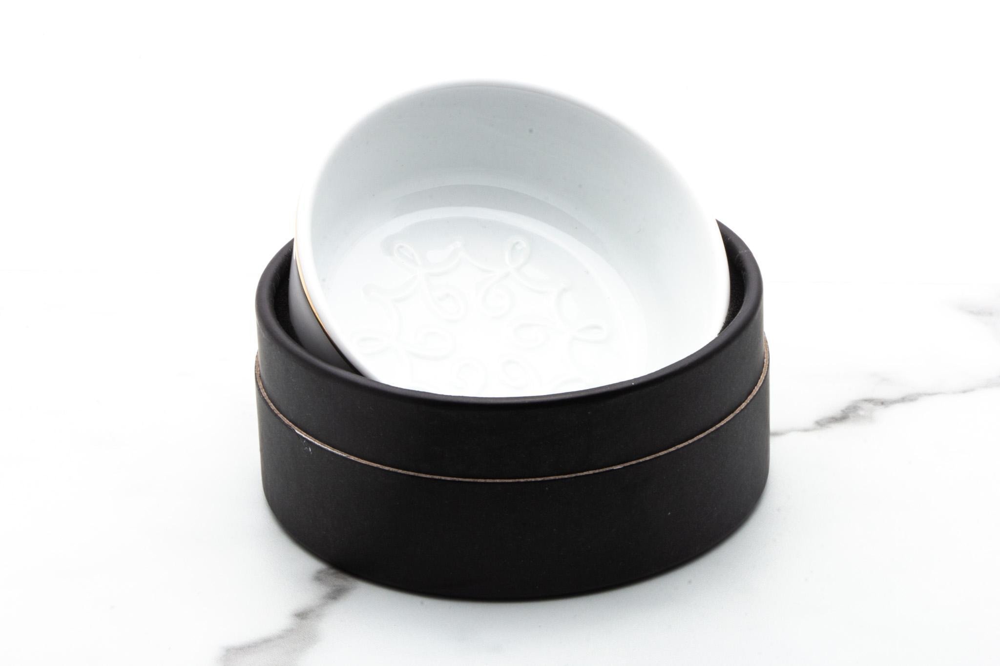The artwork is applied using traditional screen-printed ceramic transfers, a method developed nearly a century ago and still favored for its clarity and durability, well suited to a shaving bowl grounded in tradition. Each color is printed with ceramic pigment onto a transfer medium, then carefully applied by hand and kiln-fired. The result is a fused design with crisp detail, rich color, and lasting beauty.