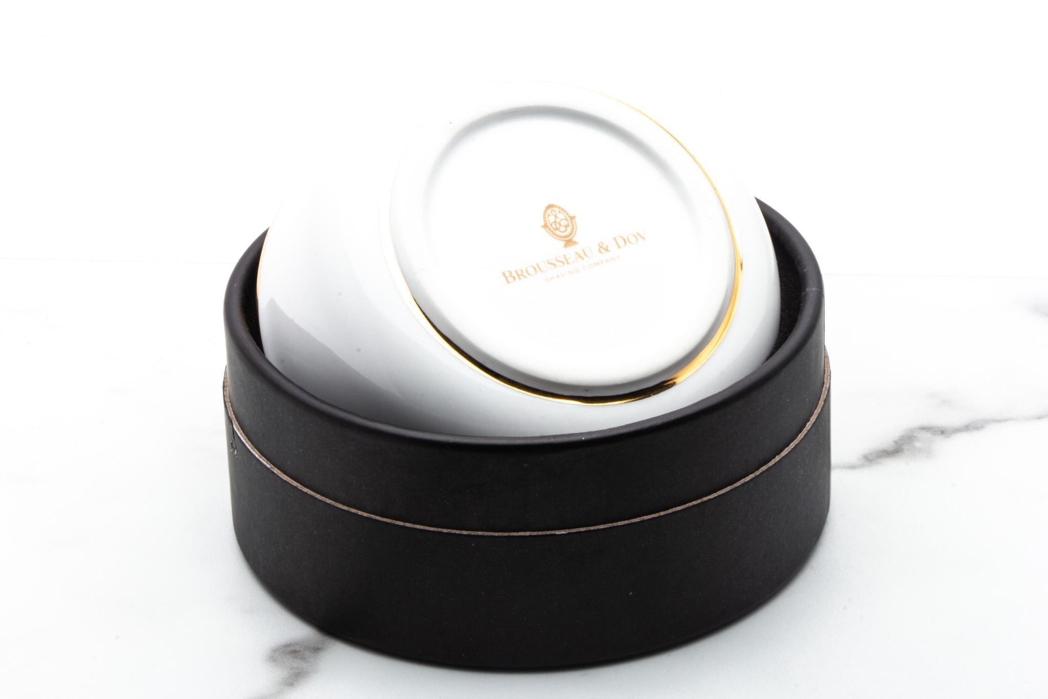 The artwork is applied using traditional screen-printed ceramic transfers, a method developed nearly a century ago and still favored for its clarity and durability, well suited to a shaving bowl grounded in tradition. Each color is printed with ceramic pigment onto a transfer medium, then carefully applied by hand and kiln-fired. The result is a fused design with crisp detail, rich color, and lasting beauty.