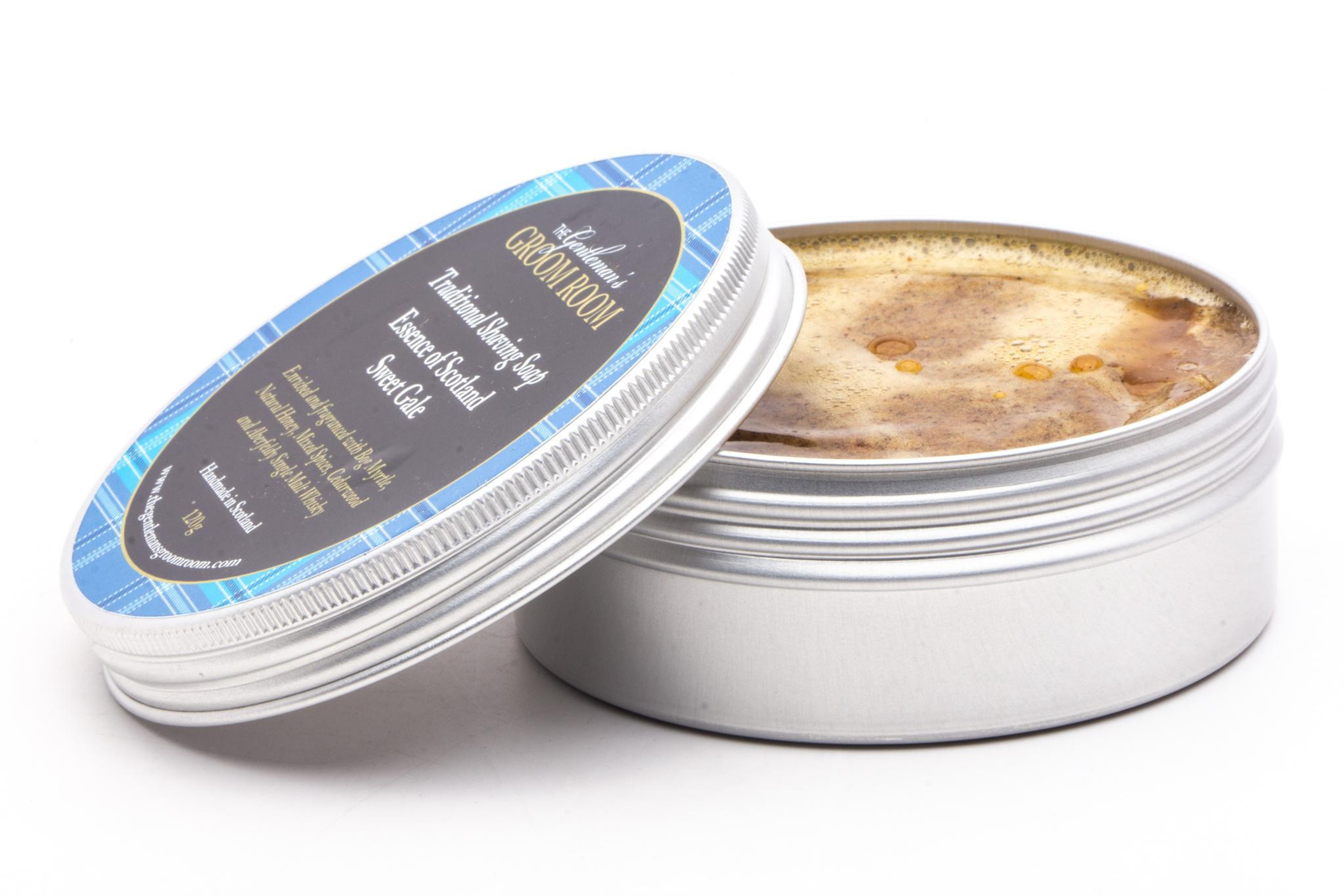 Essence of Scotland by The Gentleman's Groom Room. This is a fantastic glycerin shaving soap specially formulated and custom blended with the main ingredients carefully selected by shaving and male grooming specialist Ian Thomson at The Gentleman's Groom Room. This luxury traditional shaving soap produces an excellent lather when used with a shaving brush. It perfectly prepares the skin for a close and comfortable shave. The product is enriched with conditioning and moisturizing properties, which will ensure the perfect shave.