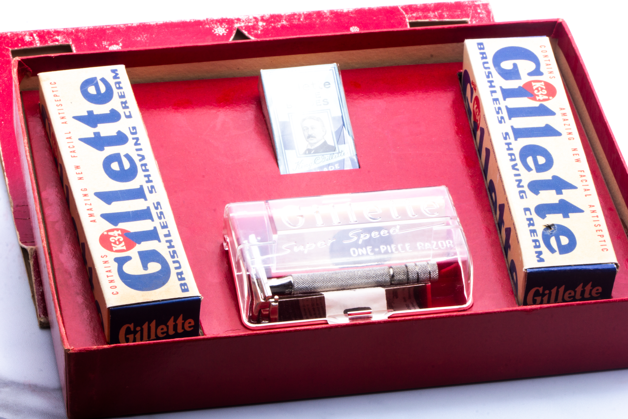 A fantastic New Old Stock Gillette gift set featuring a 1940s Gillette Super Speed Double Edge Safety Razor, never opened and never used. This set includes unopened Gillette Blue Blades along with original Gillette shaving cream tubes, all housed in a classic Christmas-themed gift box.