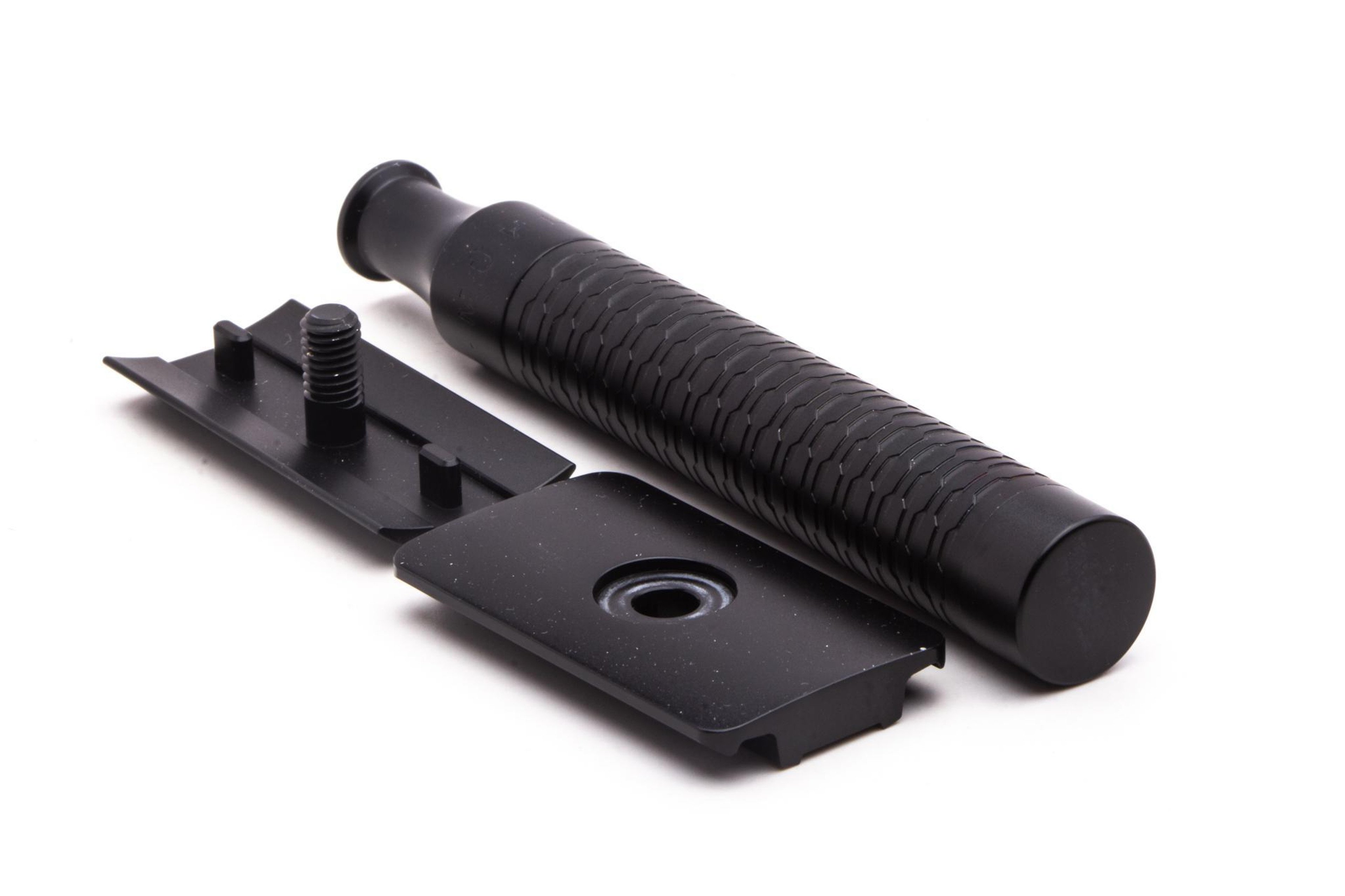 The surface structure of the handle is a modern interpretation of the knurl on the handle of a classic safety razor. The honeycomb-like structure is very tactile, offering excellent grip.