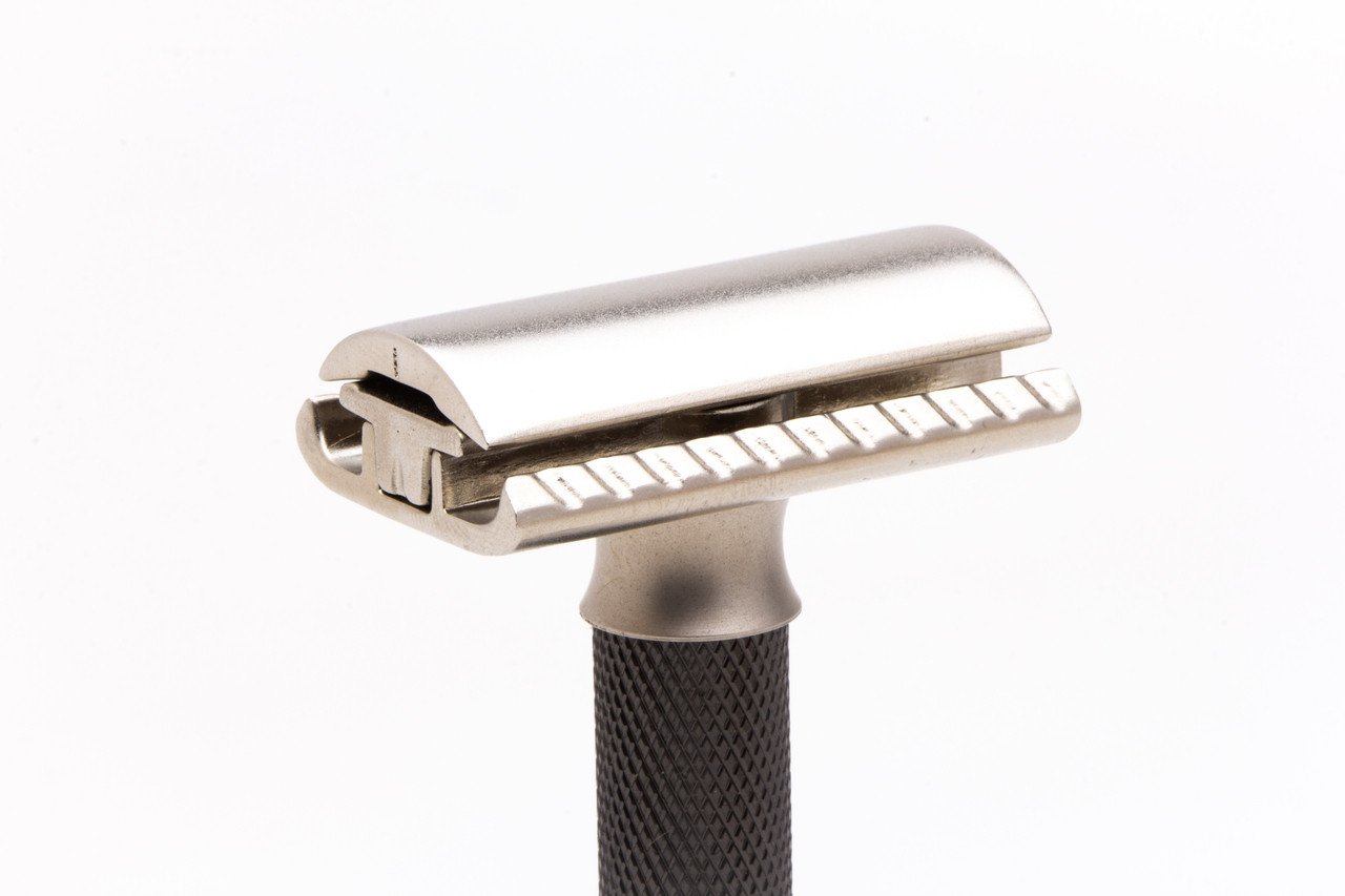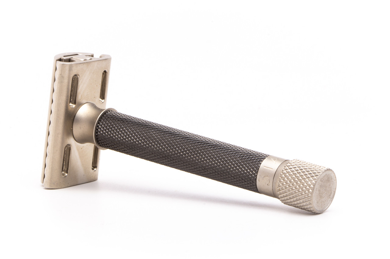 This two piece adjustable DE safety razor combines functionality with a sleek design. The adjustment knob twists smoothly to adjust to your skin and beard, and with added heft can be wielded with exact precision. The functional and beautiful knurling handle design adds control and style. This would be the perfect razor for any shaver wanting to dial in their shaves with a new DE razor!