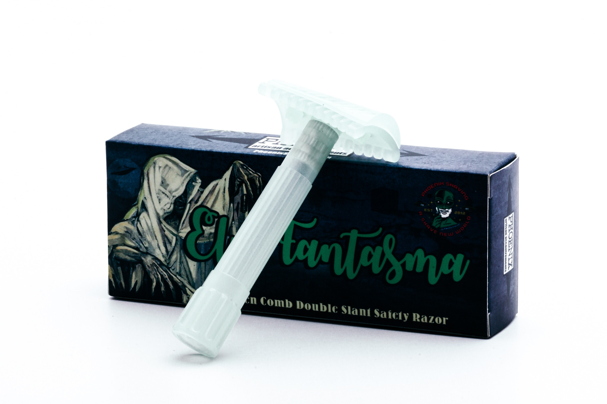 BOOM! Introducing El Fantasma, razor 1 in our Monster Slant Series! Yes, it is a slant razor and yes, it is an open comb. But more importantly, It GLOWS!!!!