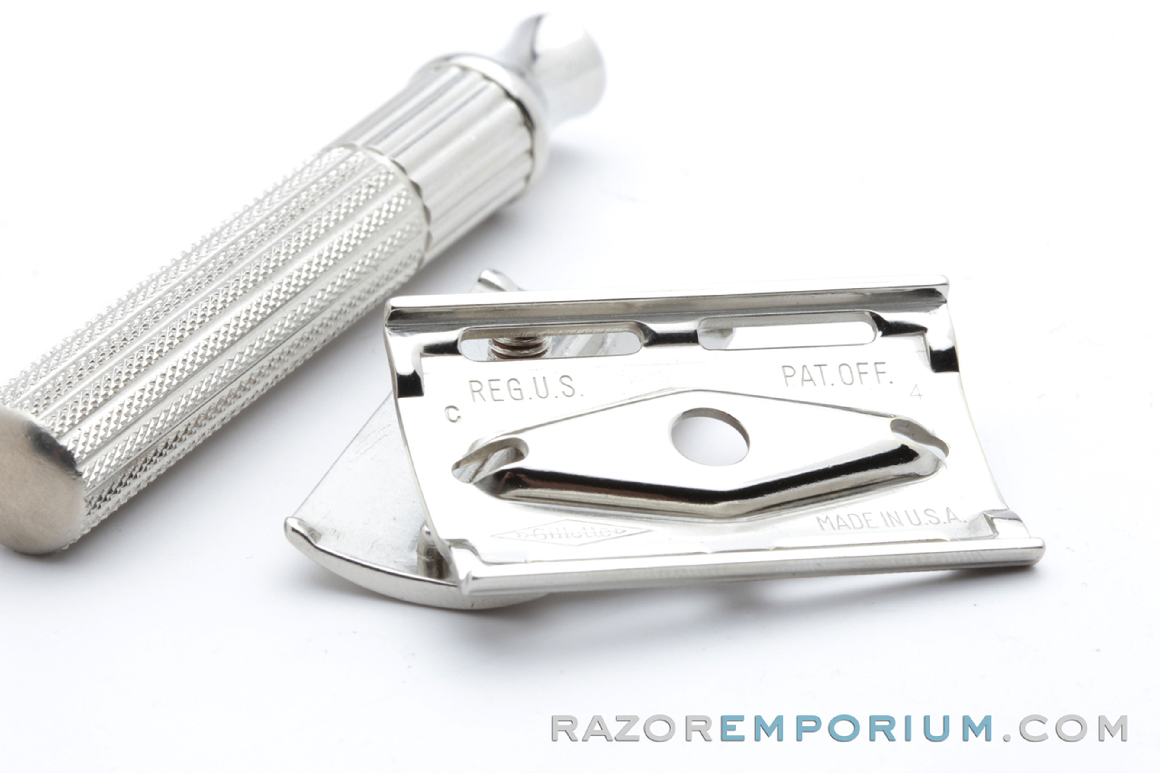 With thousands of razors successfully revamped, we have a fairly good idea of what is achievable from this process. The best results come from razors made of brass or stainless steel. This includes nearly every razor from Gillette and many other vintage brands. We prefer not to work on zinc alloy razors on a case by case basis. The following razors we can work on, will powdercoat handle, can plate doors, center rod / T-Bar, knob etc but not guard: